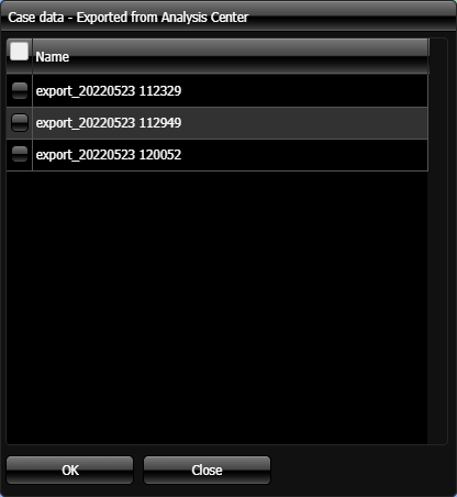 The Case data - Exported from Analysis Center dialog box list all the exported OSS-ESPA analysis center data that is available for the displayed case. You can select to display one or more exported data files.