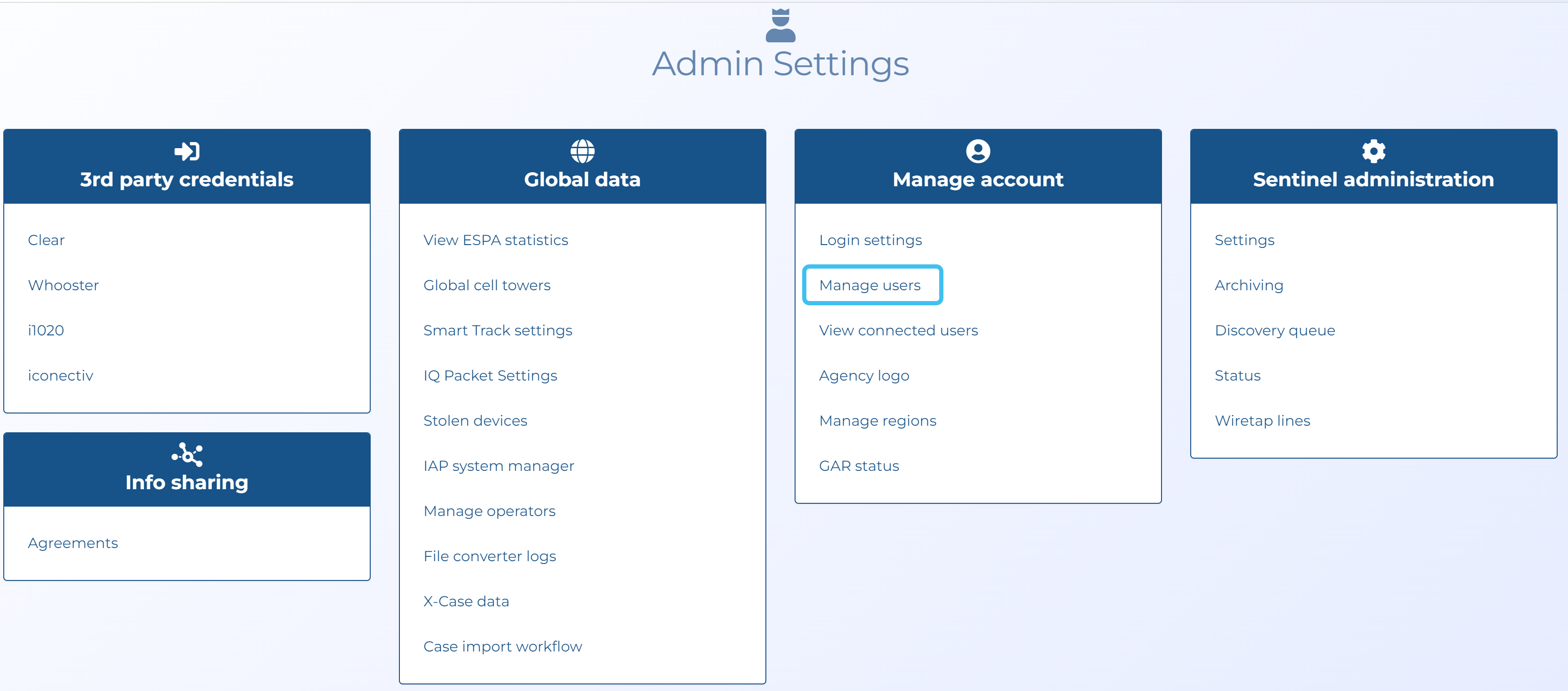 NOTE: If your Manage users screen is currently open then start at step 3.