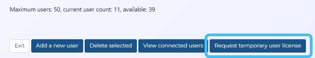 The Request temporary user license screen opens which displays your current license quota and allows you to request temporary licenses. It allows you to specify the number of additional licenses, additional concurrent users and the duration required.