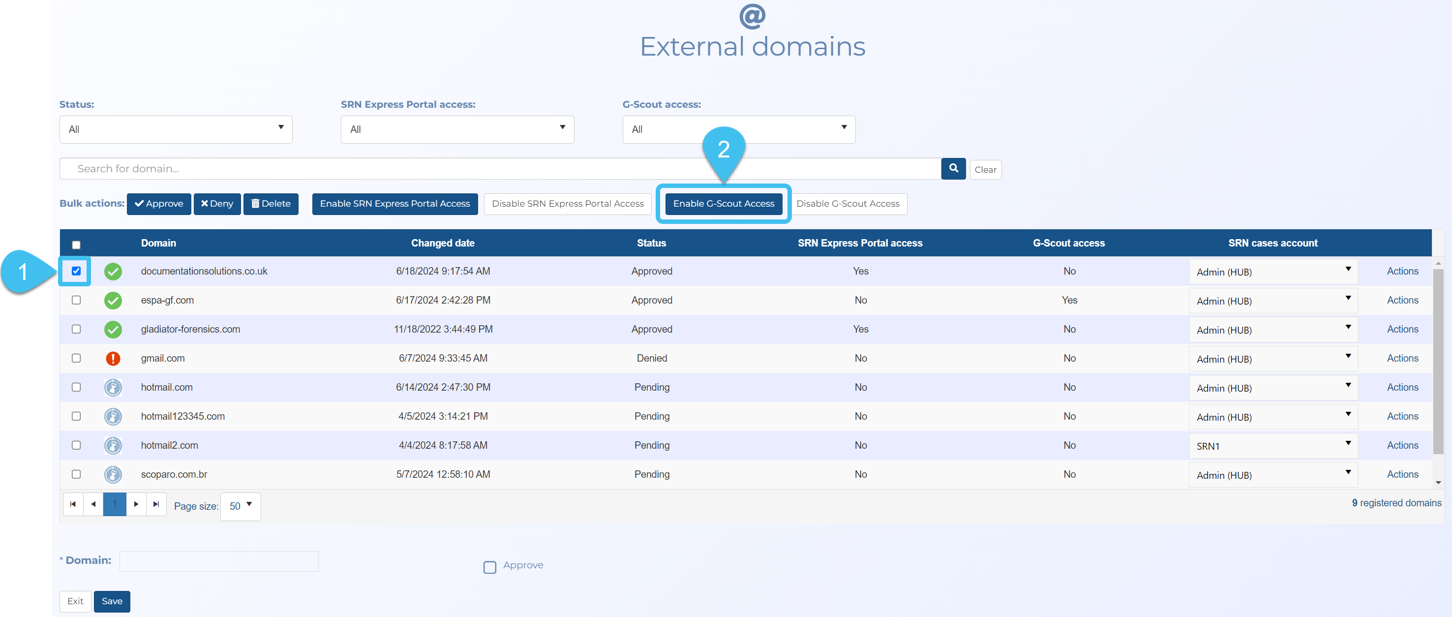 In the table, select the check-box next to the new domain then click Enable G-Scout Access.