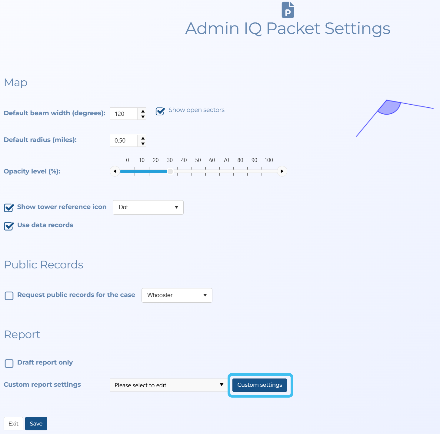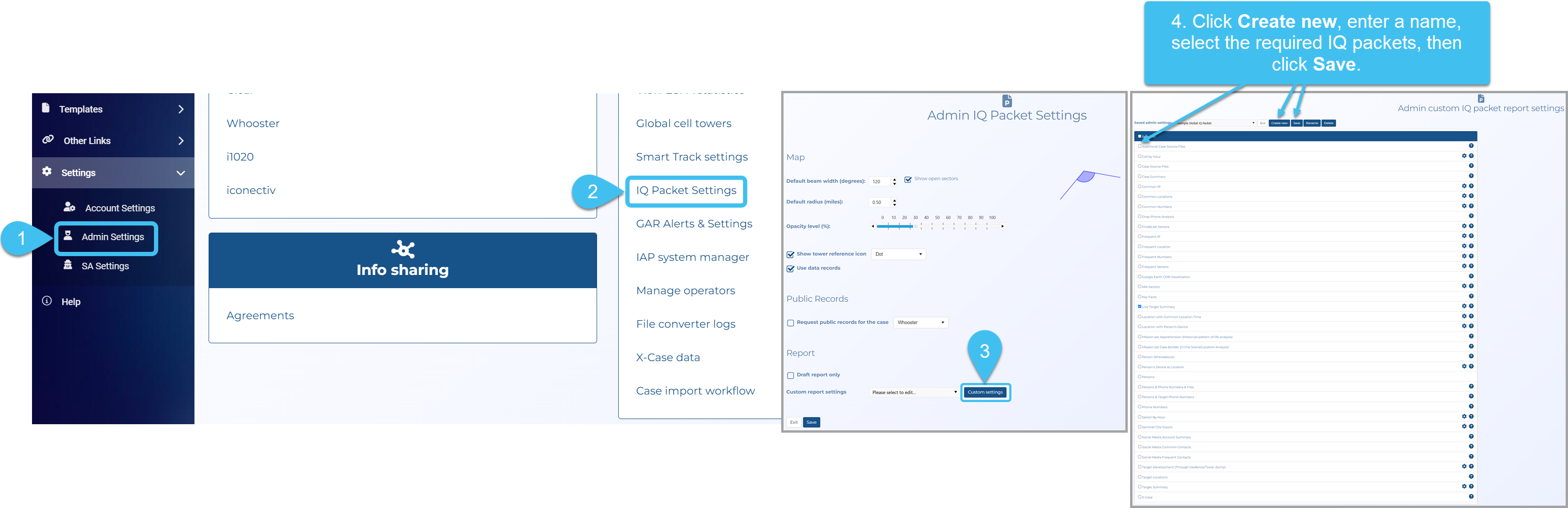 Administrators can create global IQ packet configurations which are then available to all account users. To create the configurations, administrators use the Admin Custom IQ packet report settings screen, which is opened from the main menu by clicking Settings, Admin settings, IQ packet settings in the Global data group, then Custom settings on the Admin IQ packet settings screen.