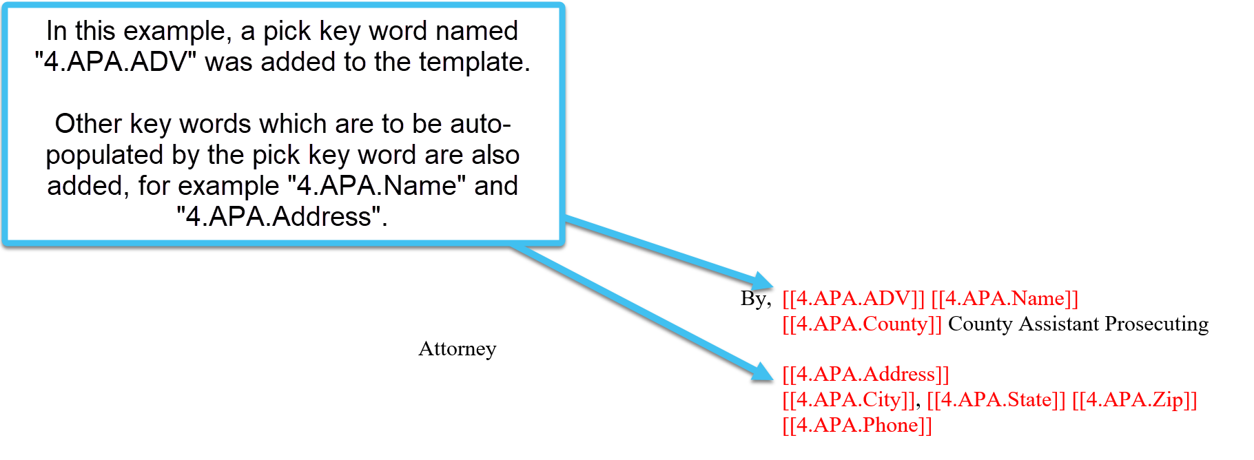Identify the key words in your Microsoft Word template file that define the pick list key word and the key words that are to be auto-populated from the pick list.