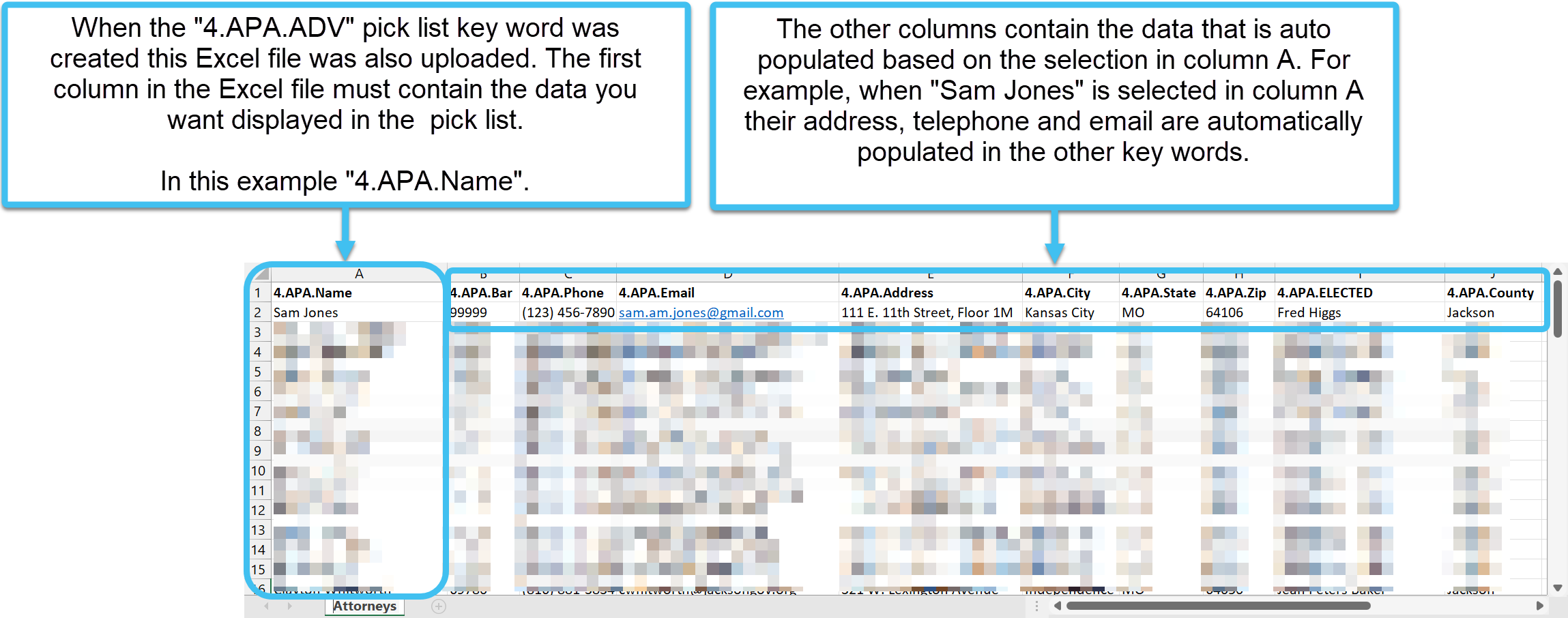 Create an Excel file where the first column contains the content you want displayed in the pick list. The other columns must include the data you want auto-populated when each item is selected from the pick list. For example: