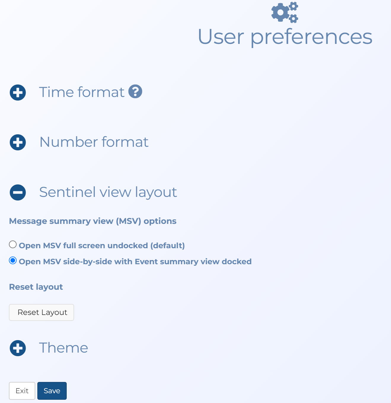 Choose whether you want the Sentinel screen's Message summary view to open as a separate window or alongside the Event summary view by selecting Open MSV full screen undocked (default) or Open MSV side-by-side with Event summary view docked respectively.