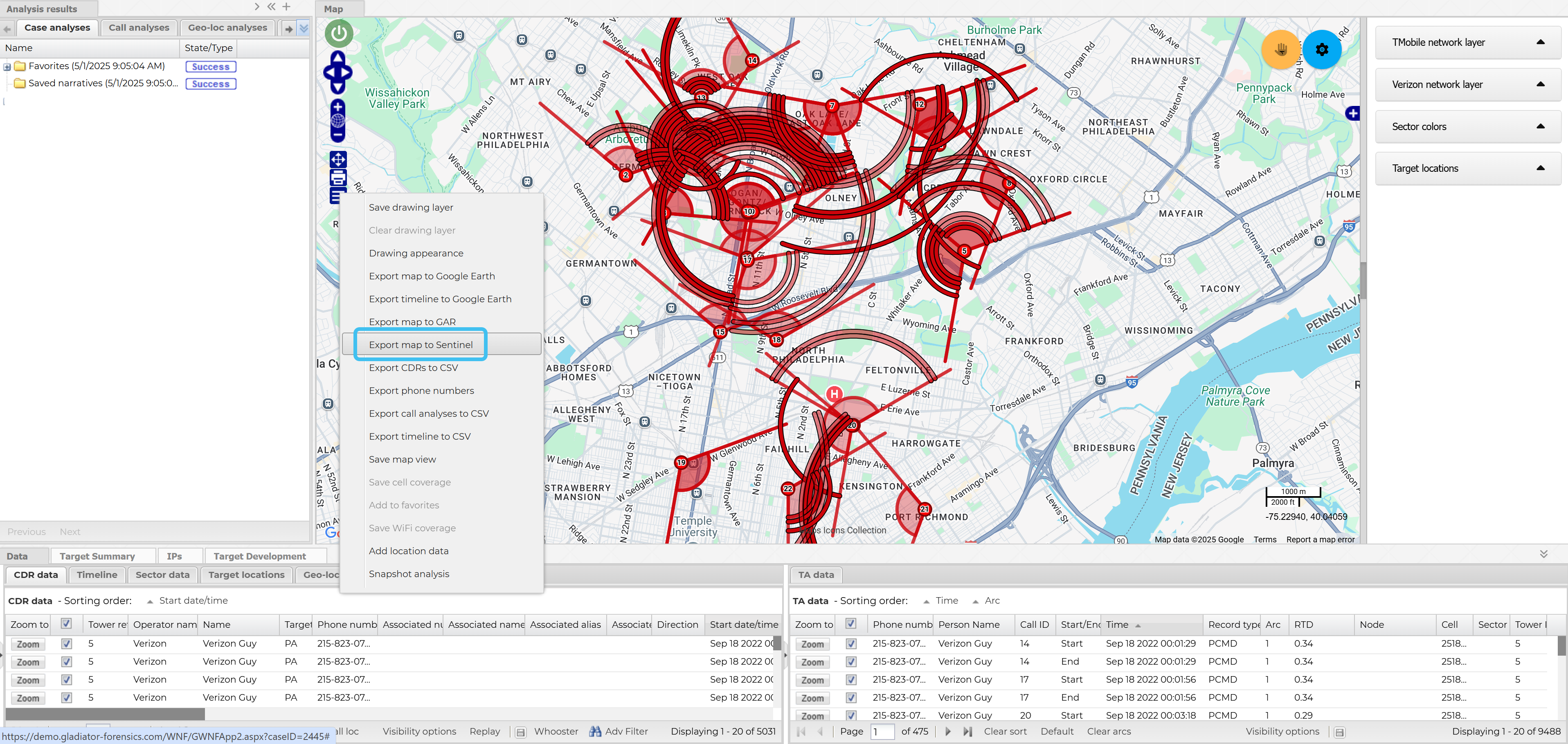 A Sentinel export folder immediately displays on the Case analysis tab of the Case management view. The map export is available for use when the state changes from Running to Success.