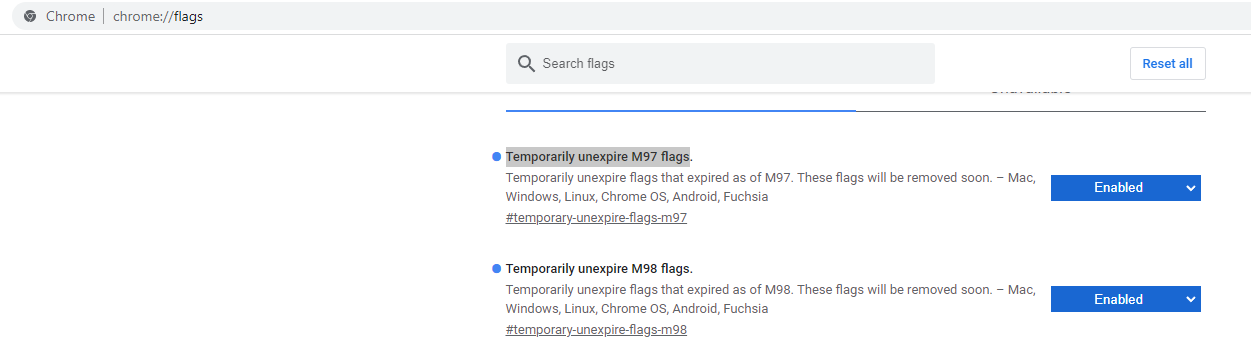 Set both Temporarily unexpire M97 flags and Temporarily unexpire M98 flags to Enabled.