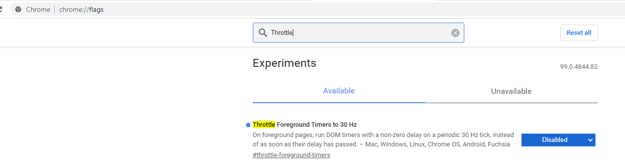 Enter "Throttle" in the search field. This allows you to quickly locate Throttle Foreground Timers to 30 Hz. Set this to Disabled.