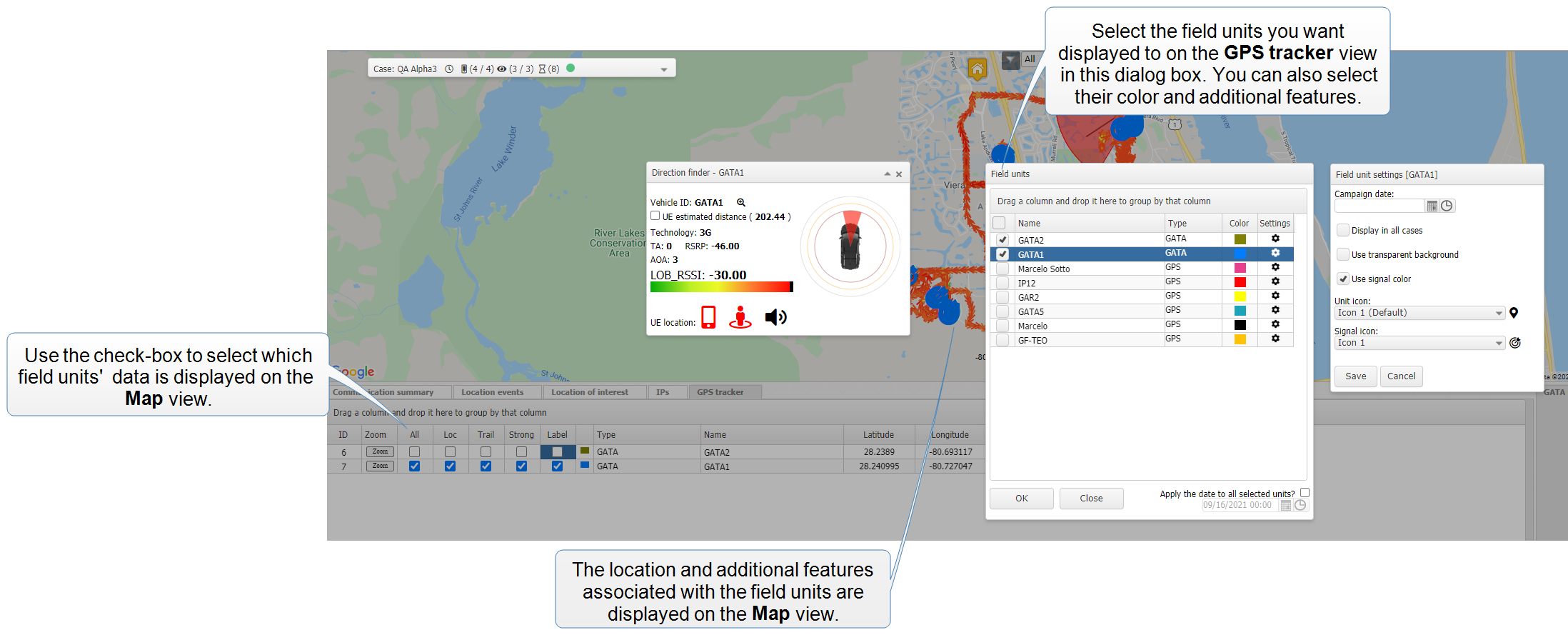 All the field units which you selected to view that are currently active, are displayed on the GPS tracker view. You can then use the check-boxes on this view to select which field units you want displayed on the map and what details you want displayed, such as its breadcrumb trail.