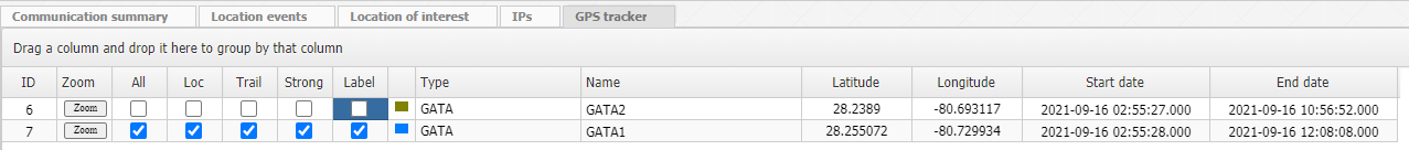 Click Zoom to center a unit on the map; displaying its current location, and its previous locations.