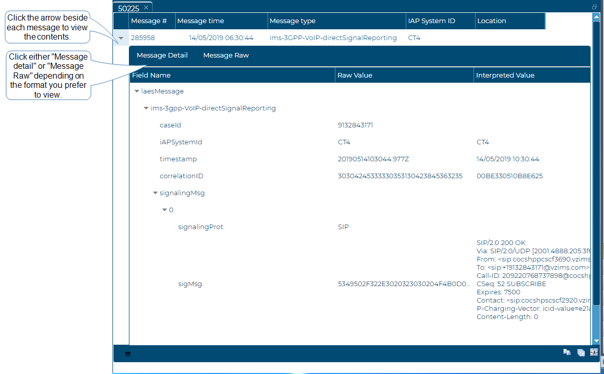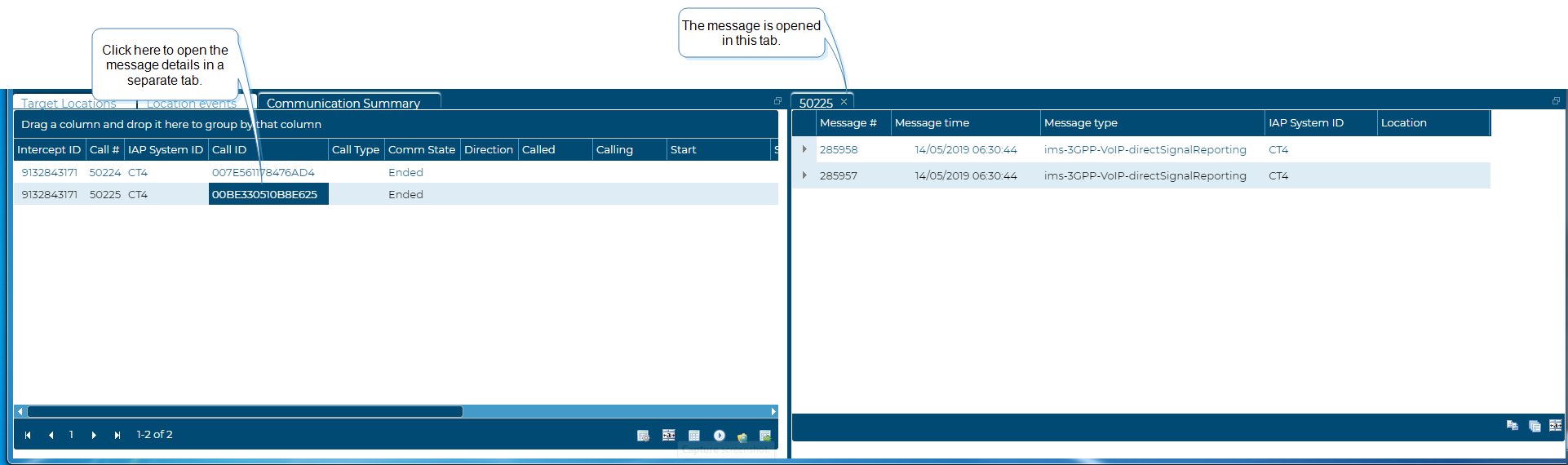 To open the Message summary view click the Comm # on the Event summary view, the Message summary view opens and is named using the Comm # which is Gladiator Forensics identifier for the call.