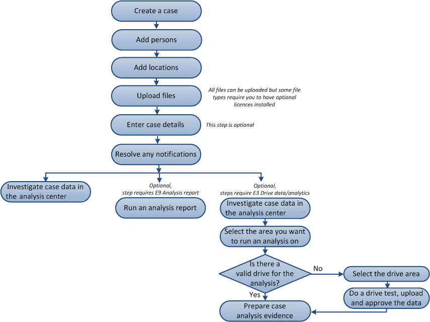 This graphic shows the typical steps involved in a historical analysis, however it is possible to create the case items in a different order, for example by uploading the files immediately after creating the case. Click on any of the steps in the graphic to go to the help topics where you can find out more about what is involved in each step.
