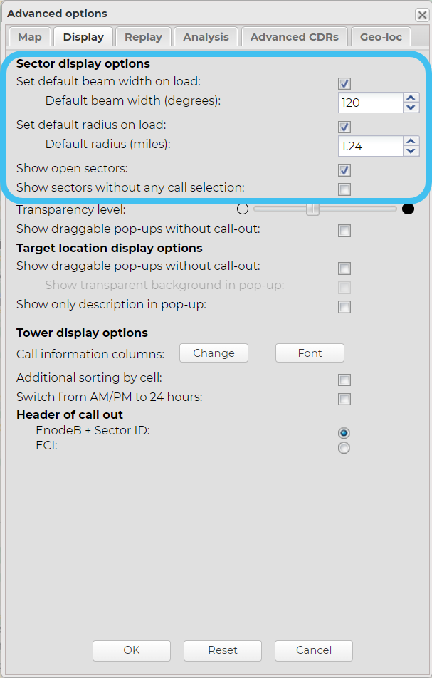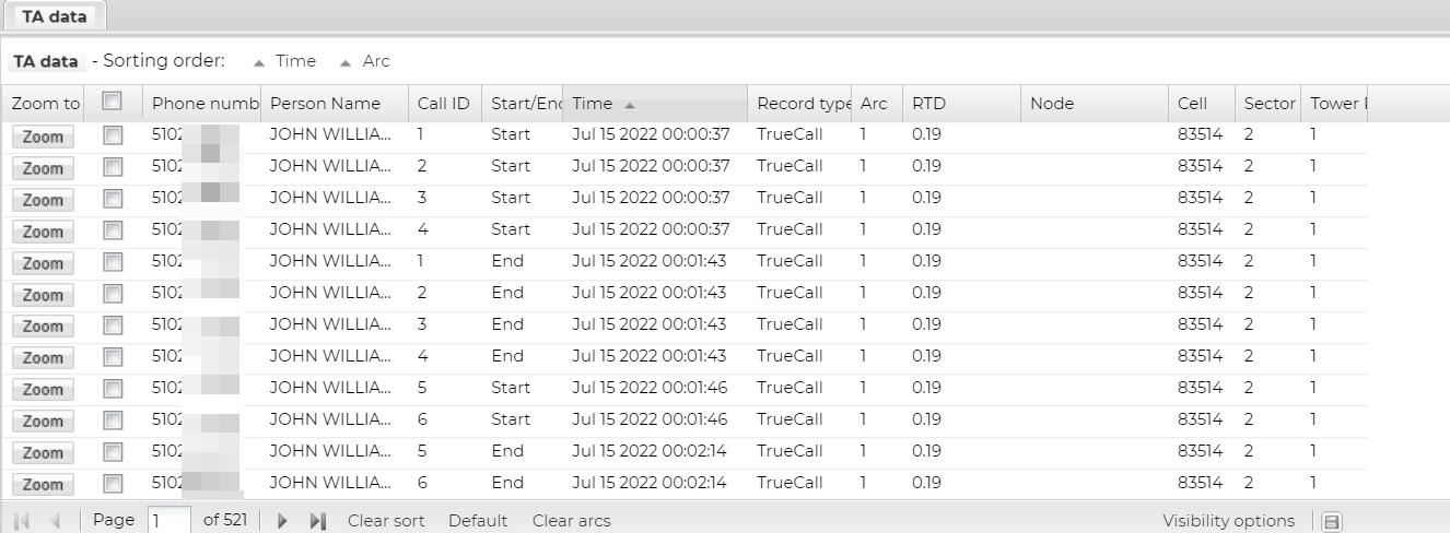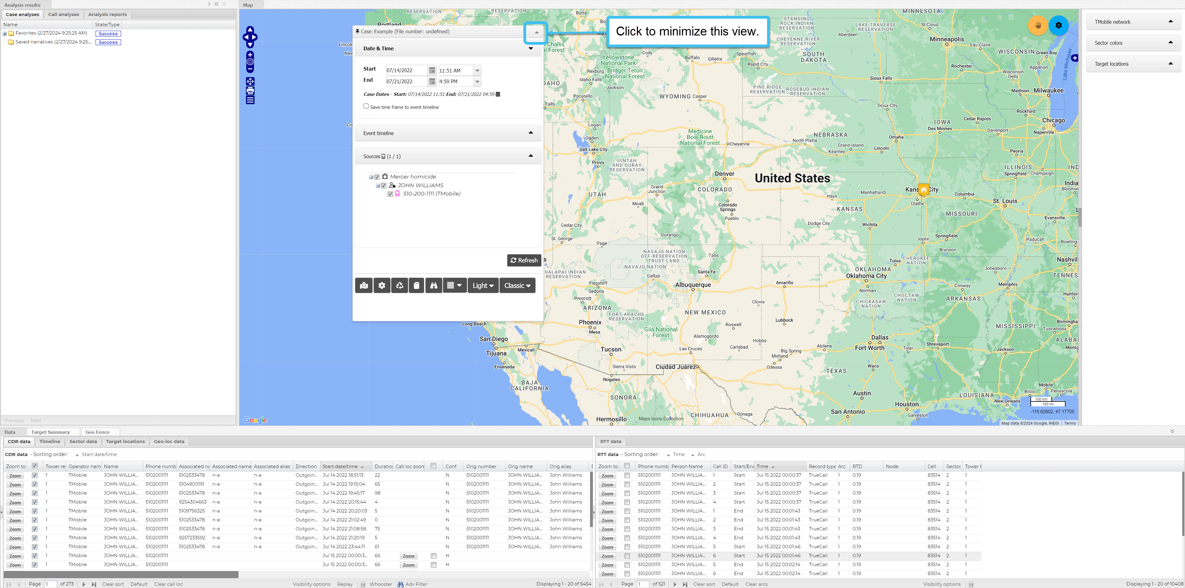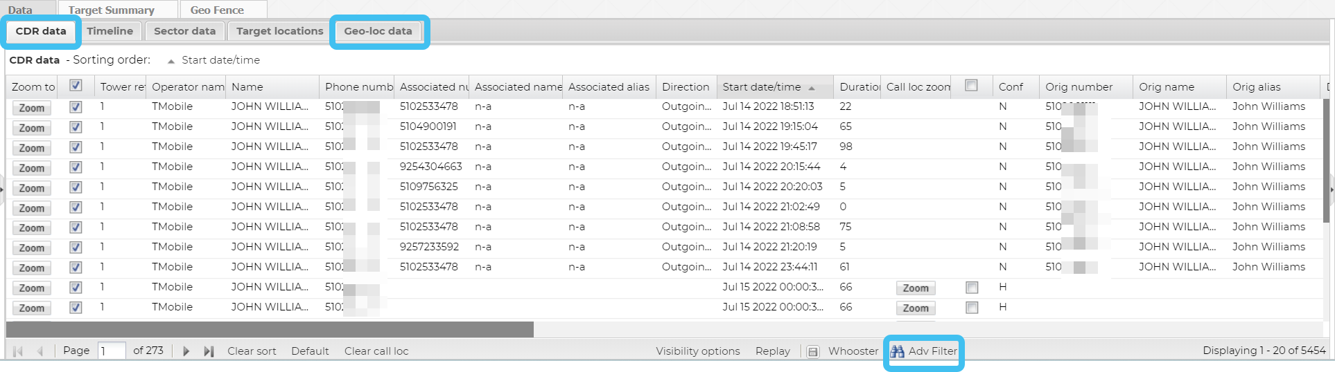 The Data view, at the bottom-left of screen by default, displays your case data, such as your CDRs and geo-location data. You can switch sectors on or off using the check-boxes and you can also zoom to a location. The column headers can be customized by clicking the drop down arrow when you hover over them. The advanced filter is also a powerful tool to sort your data by applying multiple filters.
