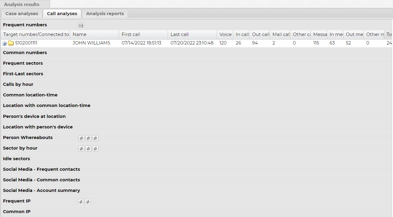 All the automated call analyses, such as Frequent numbers and Person's device at location are displayed on the Case management view's Call analysis tab, by default at the left of the screen.