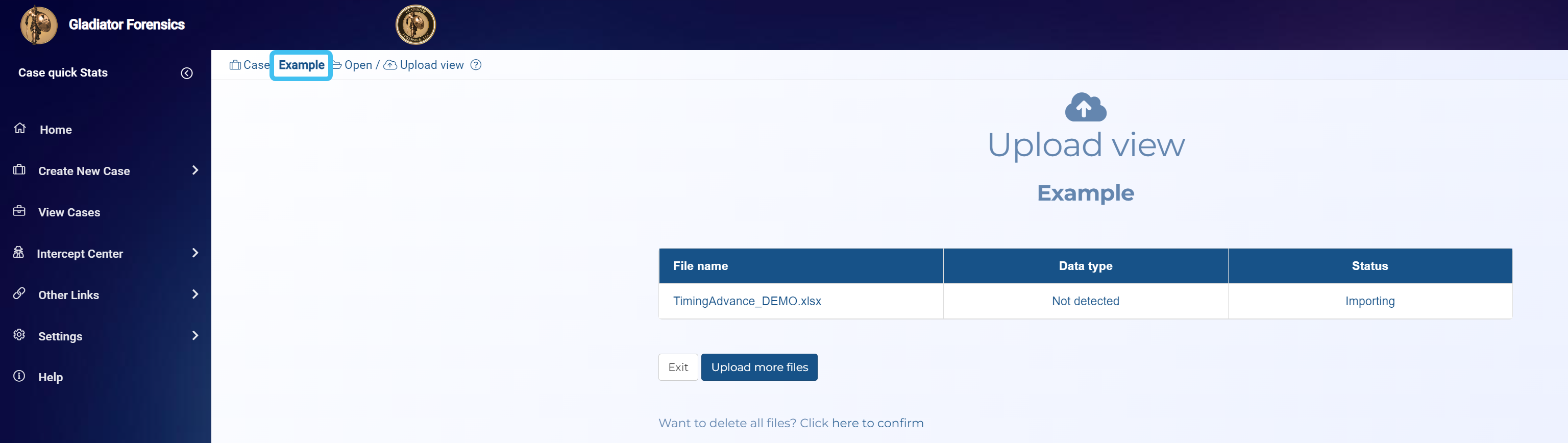 The Upload view screen opens. Click Upload more files, then select and upload the timing advance file; by uploading this last OSS-ESPA is able to match the file to the target.