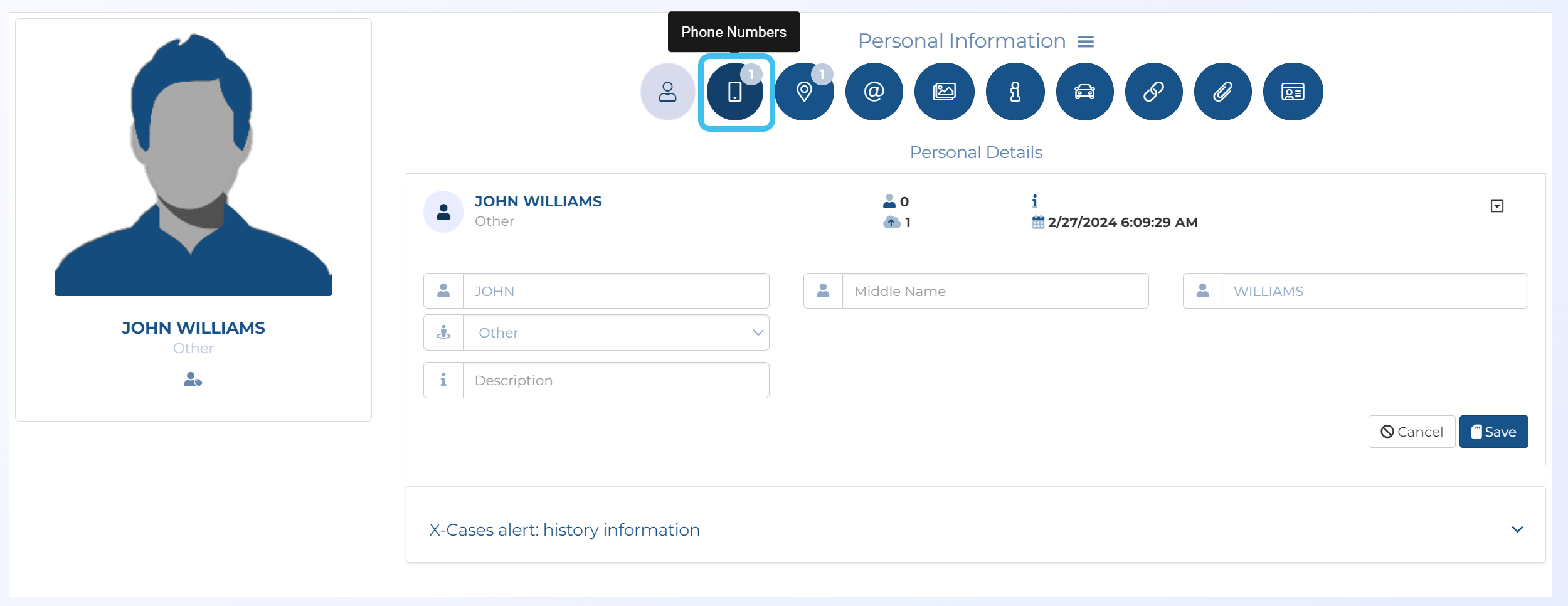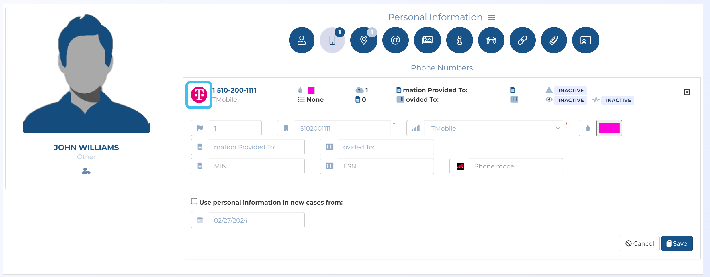 Click the operator icon to display the phone number details. Edit as required, then click Save.