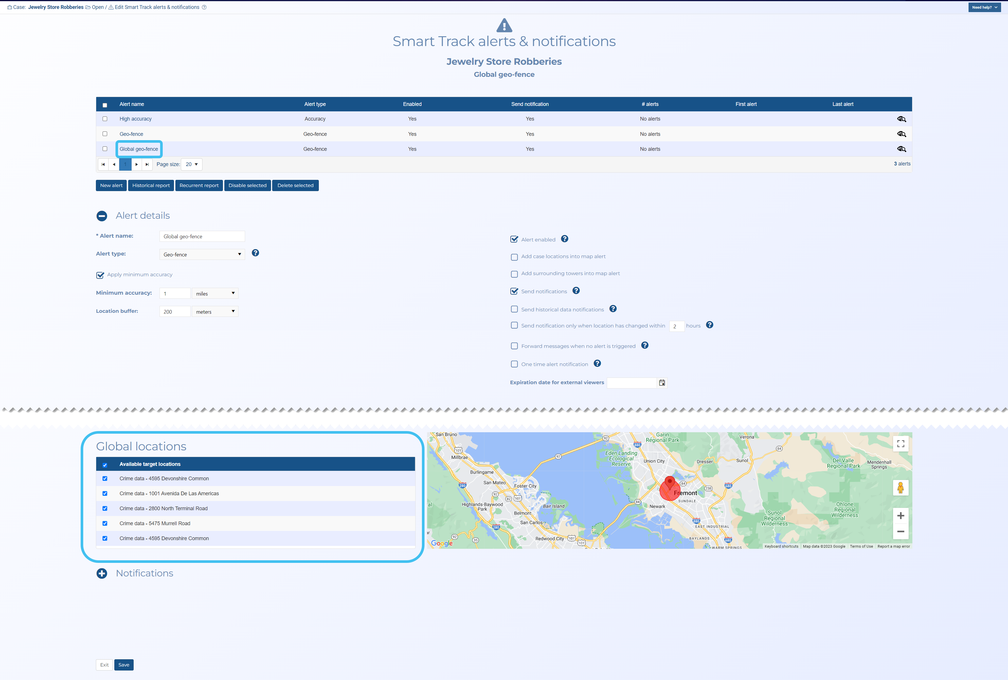 This topic describes how to set a Smart Track alert on the global location so that all active Smart Track cases in your OSS-ESPA account are notified when either their targets enter or leave the location.