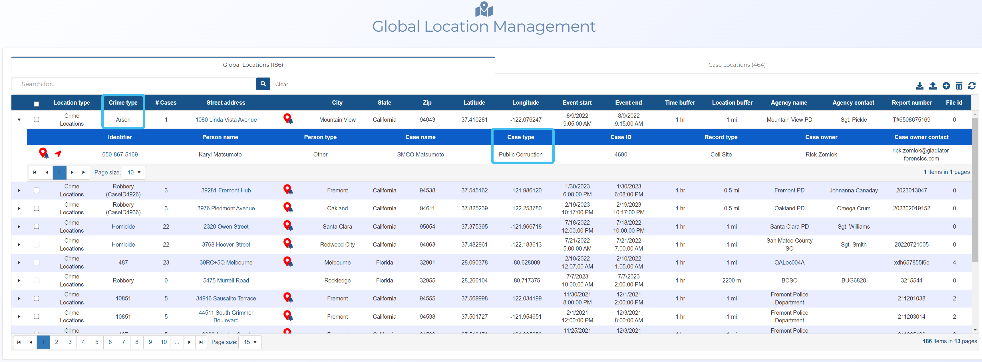 Compare the Case type and Crime type. If they are not the same then it is probably not relevant to your investigation, for example if the case is about car jacking but the global location is a homicide location they are unlikely connected. However if they are the same you should continue investigating.