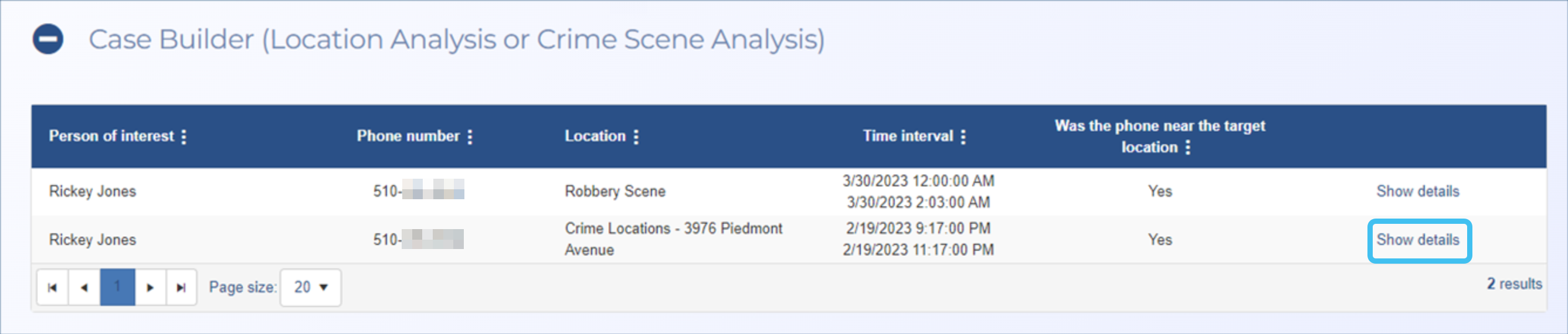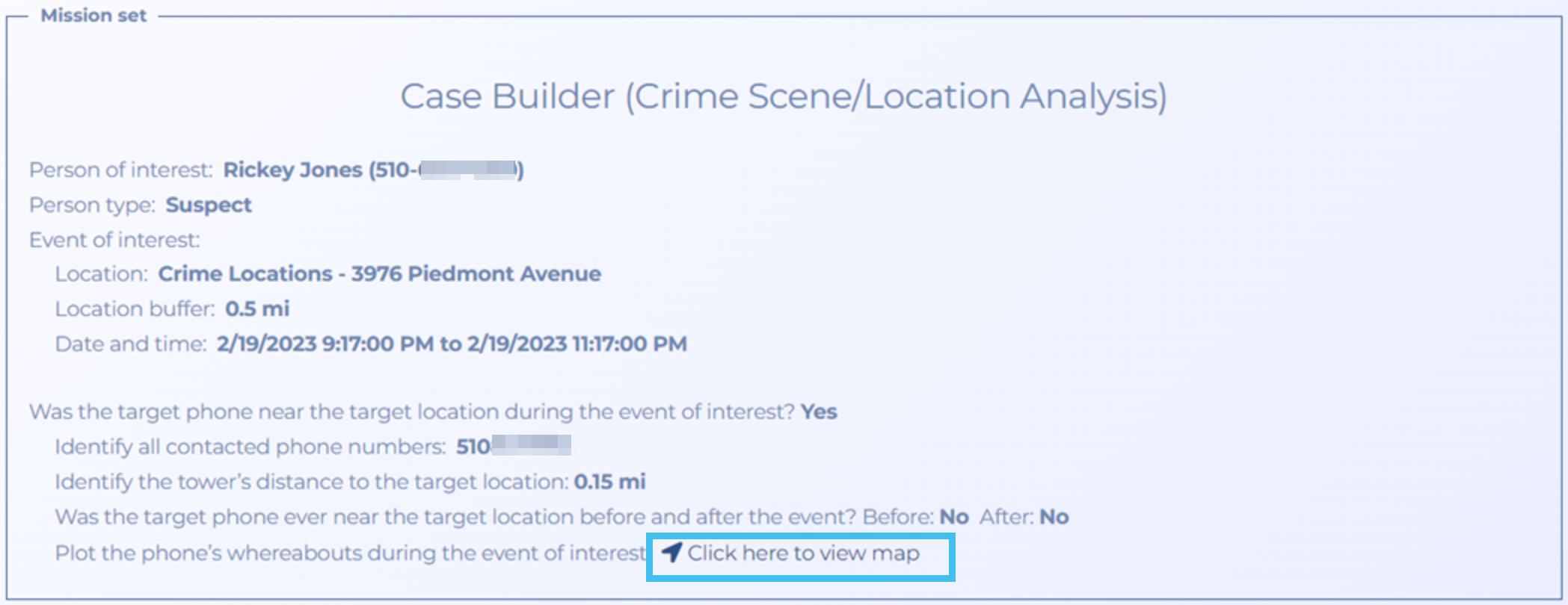 You can now analyze the calls and GPS pings available to you to determine if the person in the case may be a potential suspect. It may be that the automated analysis places them at the location during an event but on manual visual inspection the data suggests they are not a suspect.