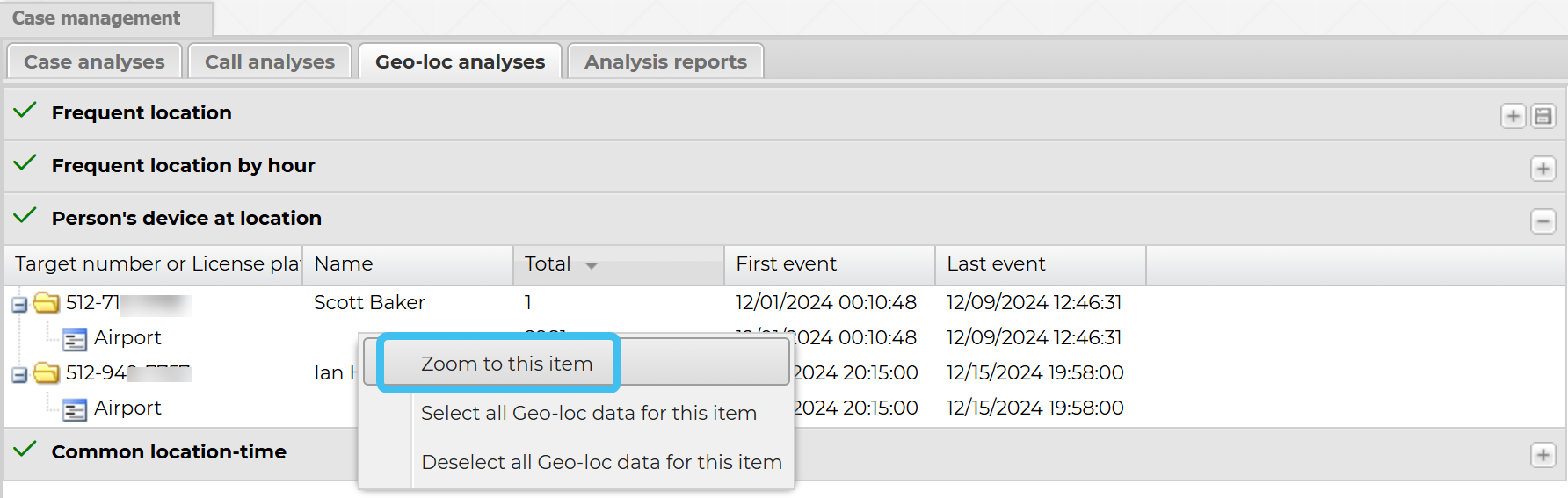 On the Geo-loc analyses tab right-click the person's device at location item you want to investigate further, then select Zoom to this item.