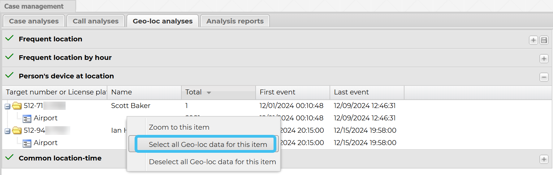 On the Geo-loc analyses tab right-click the person's device at location item you want to investigate further, then select Select all Geo-loc data for this item. Note, if you require you can do this for more than one person's device at location item.