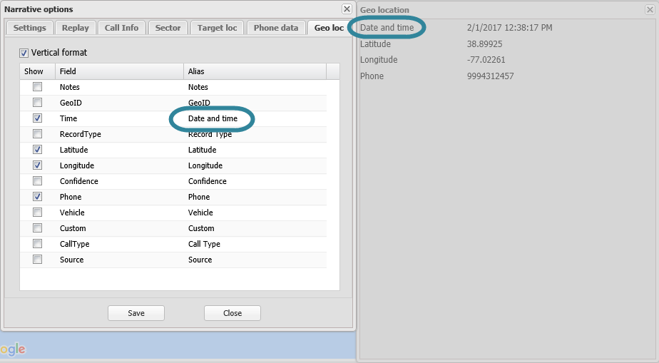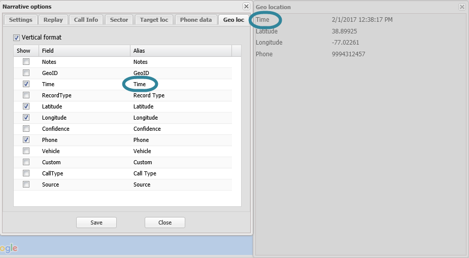 For example, for a geo-location event you may only want to display the time, latitude/longitude and the phone number. The following graphics show the difference on the Geo location panel when all headers are selected and only the four mentioned are selected.