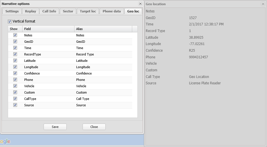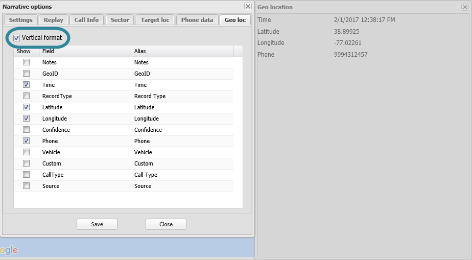 Use Vertical format to select the layout of the headers on their respective display panels. The following graphics show the difference on the Geo location panel when this setting is both selected and cleared.