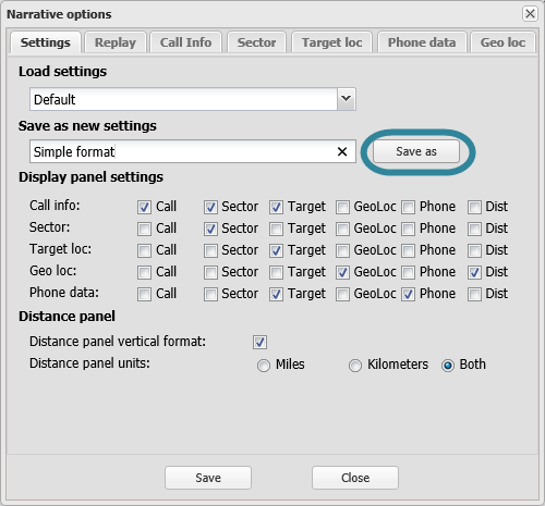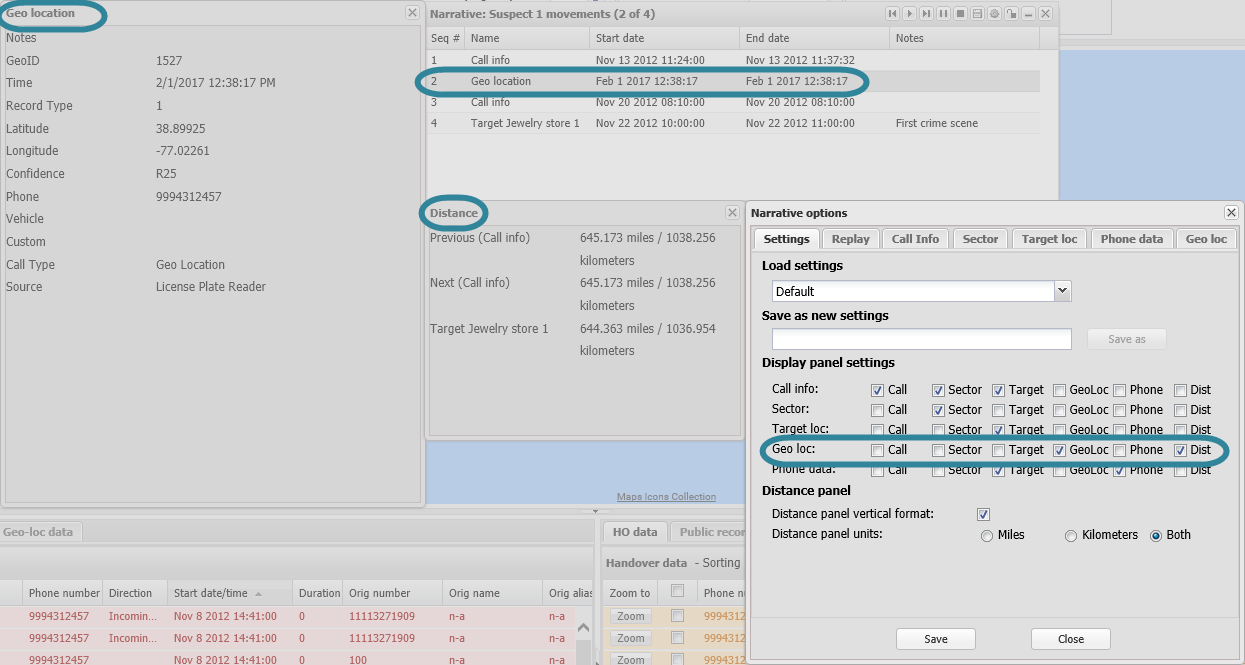 Click the Settings tab to configure what information panels are displayed for each type of event using the check-boxes in Display panel settings. For example, for a geo-location event you may want the Geo-location panel and the Distance panel to display. The Geo-location panel details the data on the geo-location event and the Distance panel details the distance between: the selected event and the previous and next events, and the distance between all the target locations you have added to the Narrative dialog box. The following graphic shows this scenario.