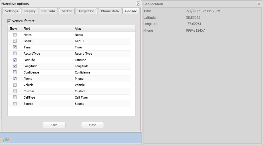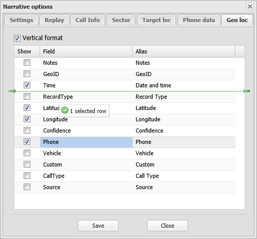Click the tab for the display panels you want to configure, either: Call Info, Sector, Target loc, Phone data or Geo loc tabs.
