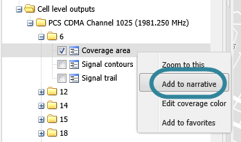 When both the Narrative dialog box and the Cell coverage tab are both open select the check-box beside the cell level output you want to add to the narrative then left-click and select Add to narrative. Note, the only cell level outputs you can add to narratives are Coverage area, Dominant area and Signal contours.