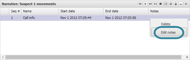 On the Narrative dialog box, right-click the event you want to add a note to then select Edit notes.