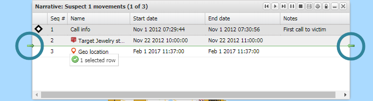 When the Narrative dialog box is open a Nar column is displayed on the following Data view tabs: CDR data, Timeline, Sector data, Target locations and Geo-loc data. To add an event from these tabs to the Narrative dialog box simply select the event in the Nar column.