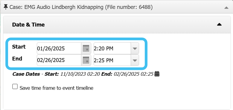 The Start and End dates and time used by default are those of the first and last records in all the source files uploaded to the case. If you want to change these dates enter your required dates, or alternatively you can select events from Event timeline.