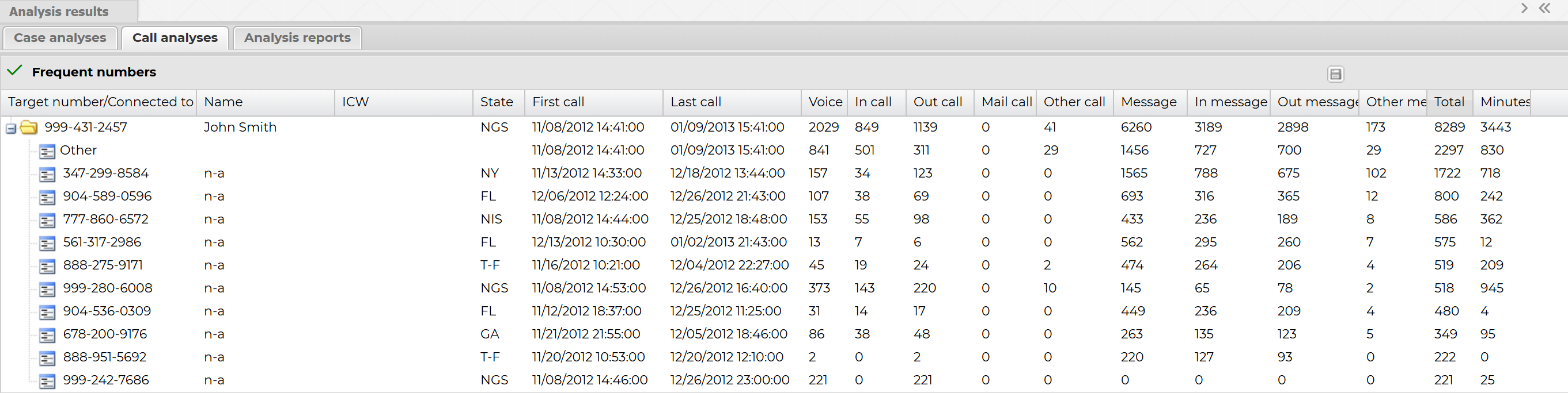 Click beside a target phone number to display the details of the frequently called phone numbers. This allows you to view the top ten most frequently called numbers and the call data. The ICW (in contact with) column allows you to quickly determine if an associate of your target is also an associate of other targets in your OSS-ESPA account. If they are then this column contains a colon-separated list of the other target names or phone numbers.