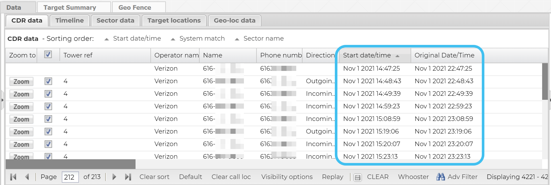 There are two date/time columns on the tab, Start date/time and Original date/time. The Start date/time column displays the date/time using the local time of the tower and also includes any manual timezone adjustments you have applied, but if the location information for the call record could not be found in the cell tower data file and you have not applied a manual timezone adjustment then the UTC time is displayed. The Original date/time always displays the time in the imported CDR file.