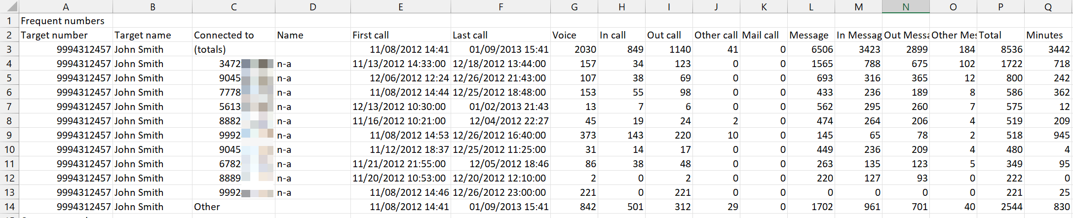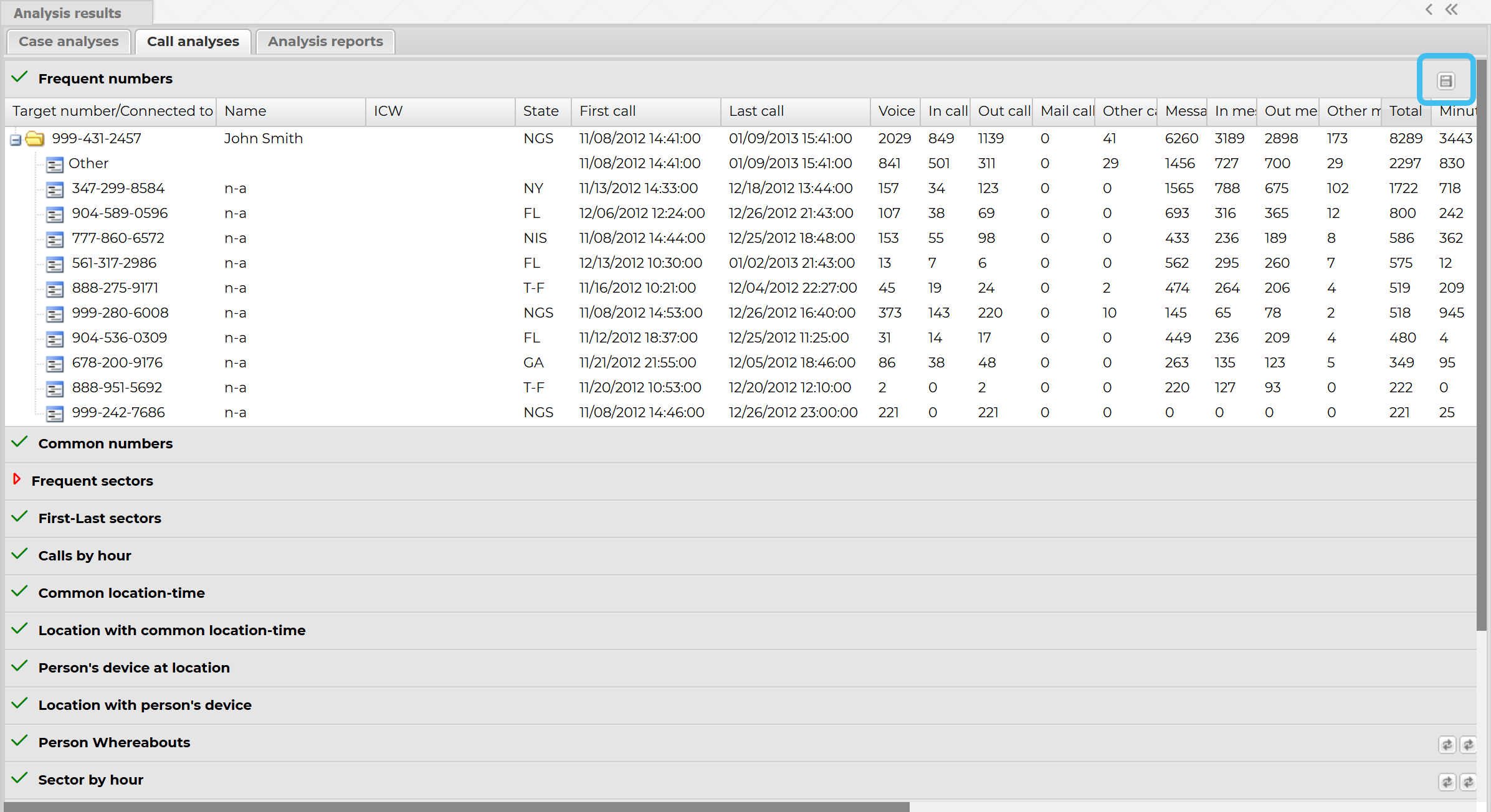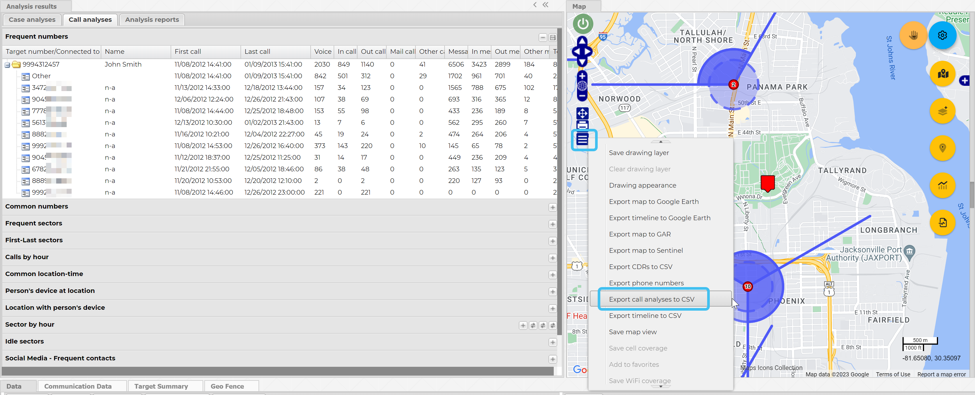right-click on the map or select then select Export call analysis to csv. You can also select Export phone numbers which exports a csv file with just the unique numbers and the total frequency count.