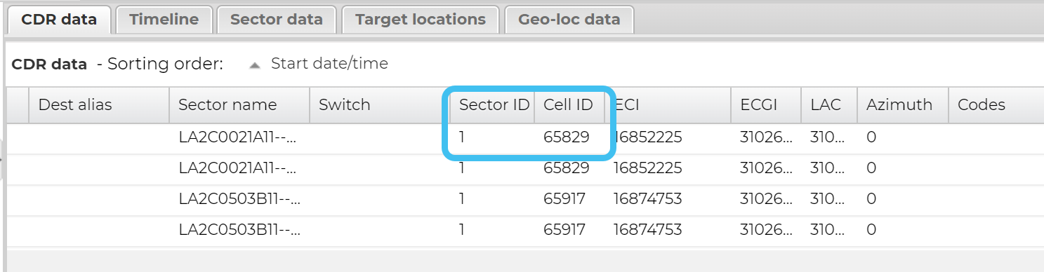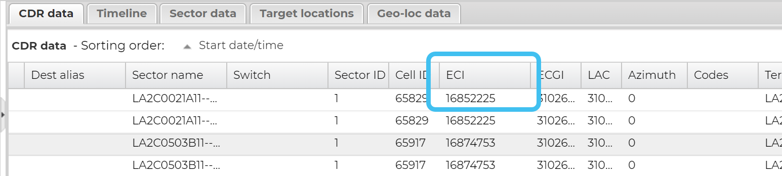 On the CDR data tab's ECI column, note the ECI (E-UTRAN Cell Identifier) value for the call of interest. The ECI is what is used to uniquely identify a cell.