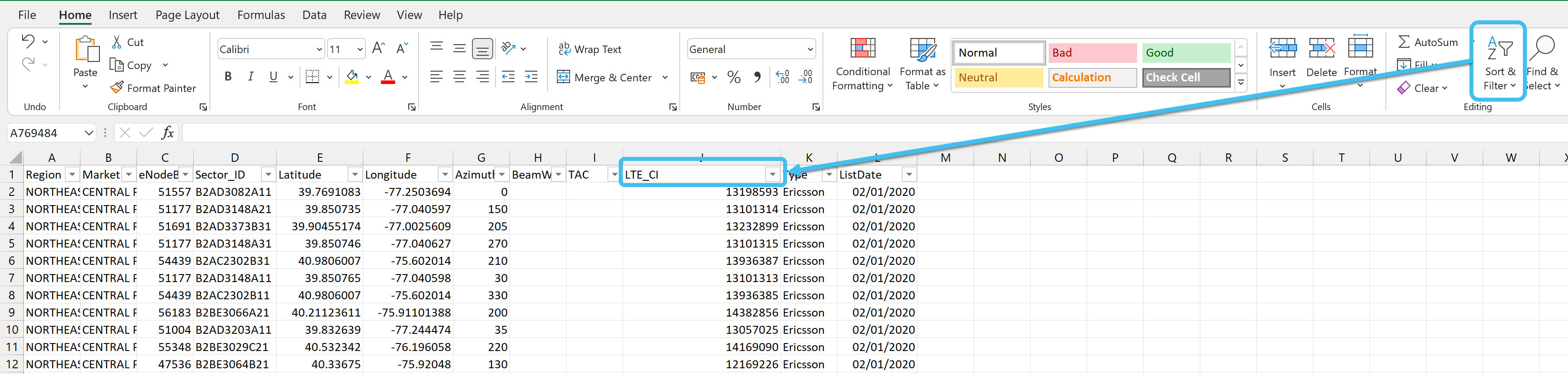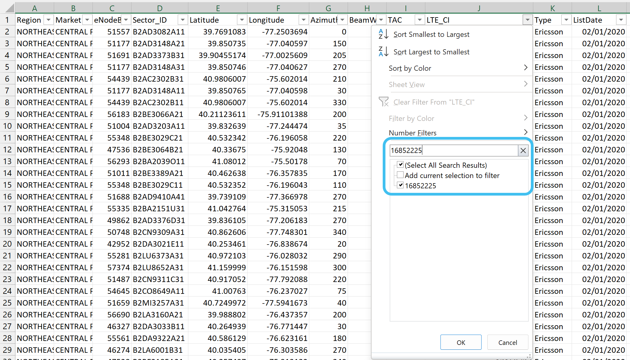 Open the correlating cell tower list in Excel, then apply a filter to the top row.