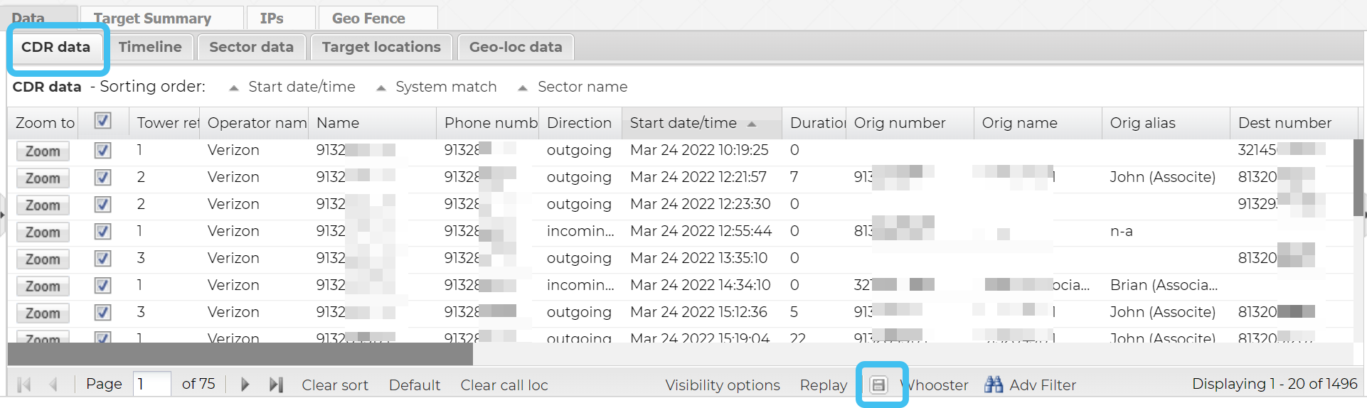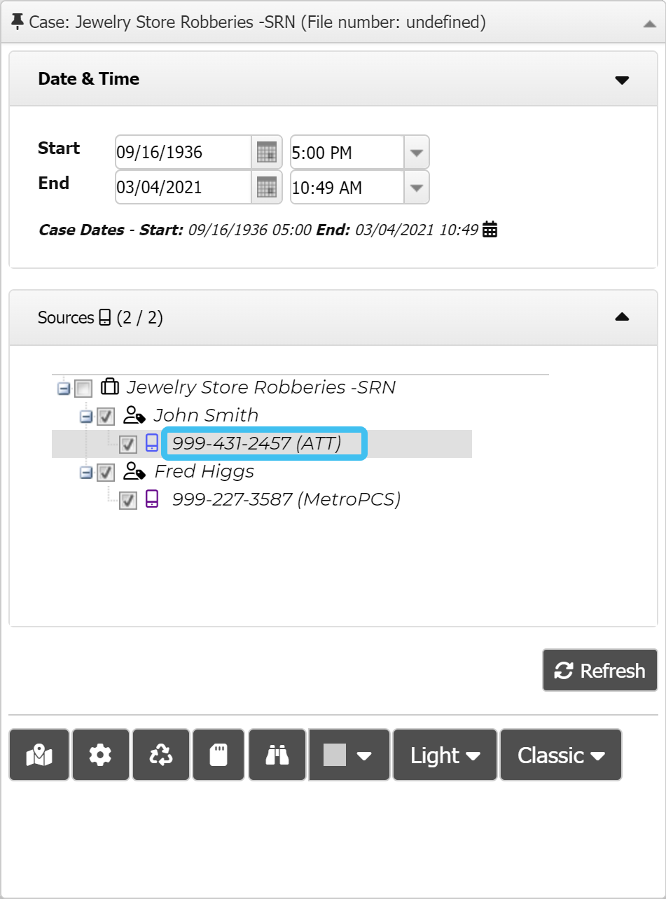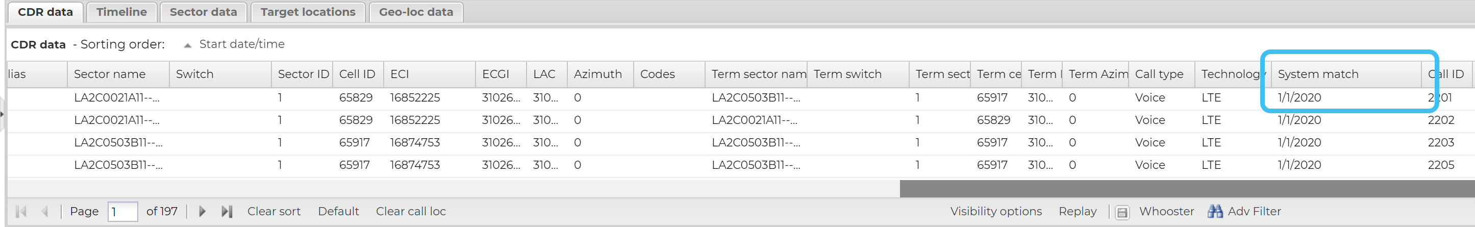 On the CDR data tab's System match column, note the cell tower file used for the correlation. In the following example it is the 1/1/20 T-Mobile cell tower list.