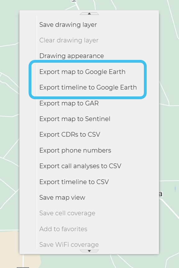 To run the export, either right-click on the map or select then select either Export map to Google Earth or Export timeline to Google Earth.