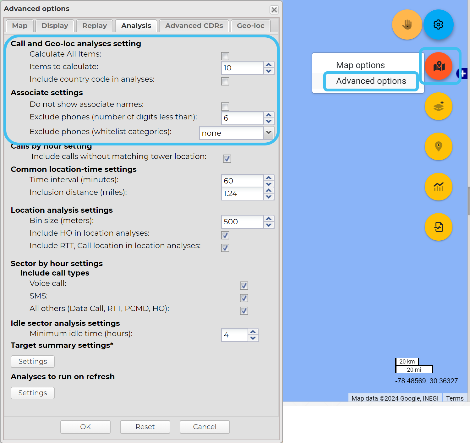Optionally, if required you can change the number of results displayed from the default of ten by using the Advanced options dialog box. To do this, hover over on the top-right of the map, click and select Advanced options. On the Advanced options dialog box click the Analysis tab. You can either change Items to calculate from 10 or select Check all items to display them all. Using Associate settings you can also define what associate information is displayed in the analysis. You must click Refresh to update any changes on the Call analyses tab.