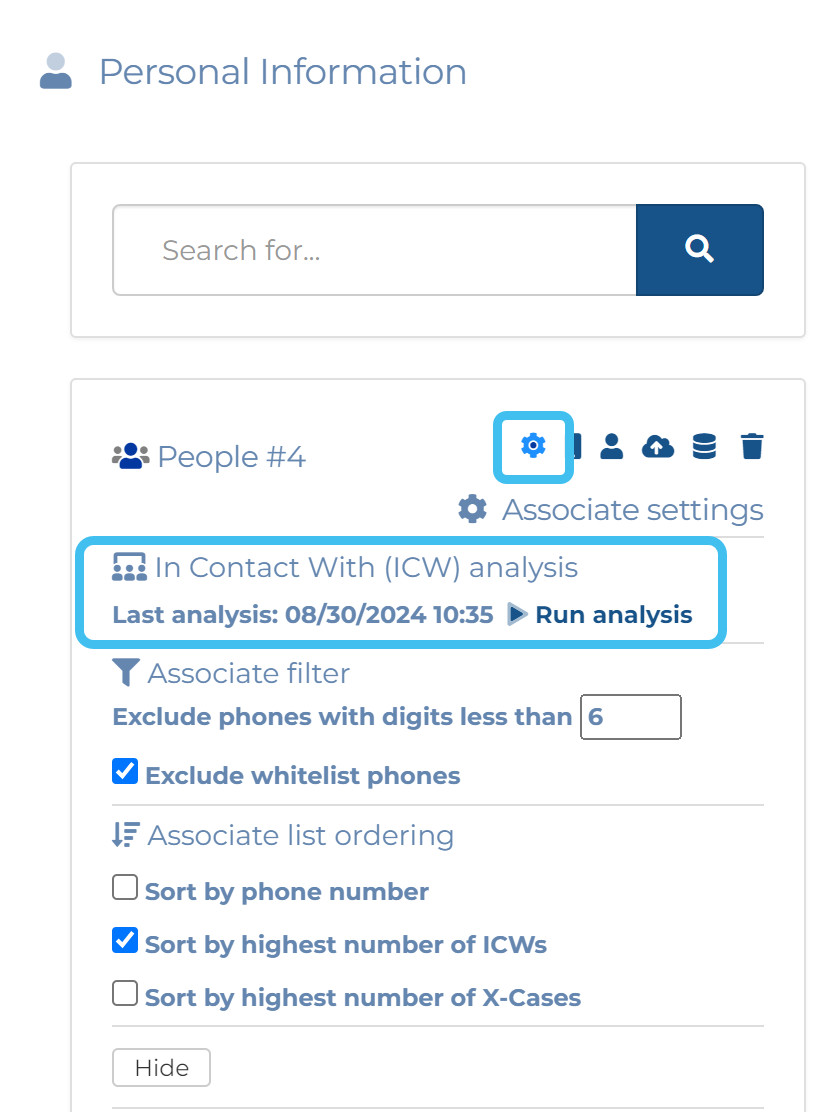 NOTE: The ICW analysis is not run automatically. If you want to ensure the data in the ICW column is up to date then to view the last time the analysis was run, or to rerun it, open the case's People and devices screen, then in People click to open the Associate settings where the date and time of the last analysis is displayed. Click Run analysis if required.