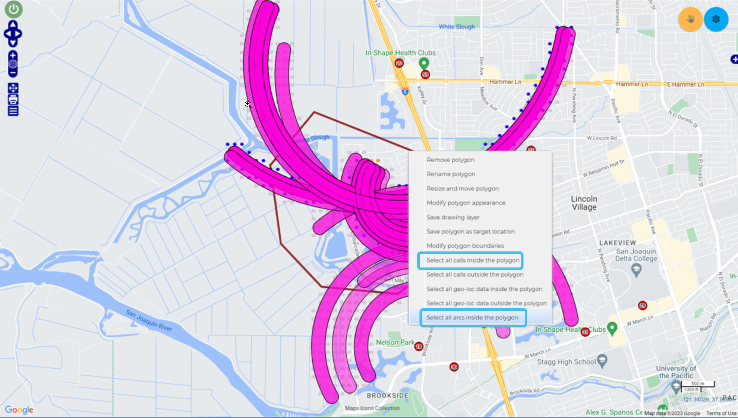 by selecting the geo-location data and TA data you want to analyze. You can do this by either selecting the data using the check-boxes on the Geo-loc data and TA data tabs or by using the map. To select the data on the map, you can either right-click a sector then from the pop-up menu click Select all arcs from this sector, or draw a polygon around the data then right-click the polygon and from the pop-up menu click Select all calls inside the polygon and Select all arcs inside the polygon.