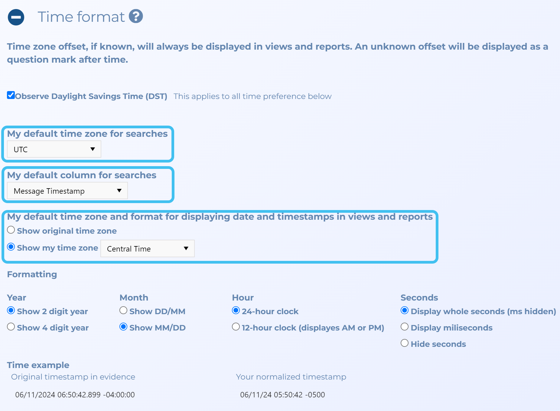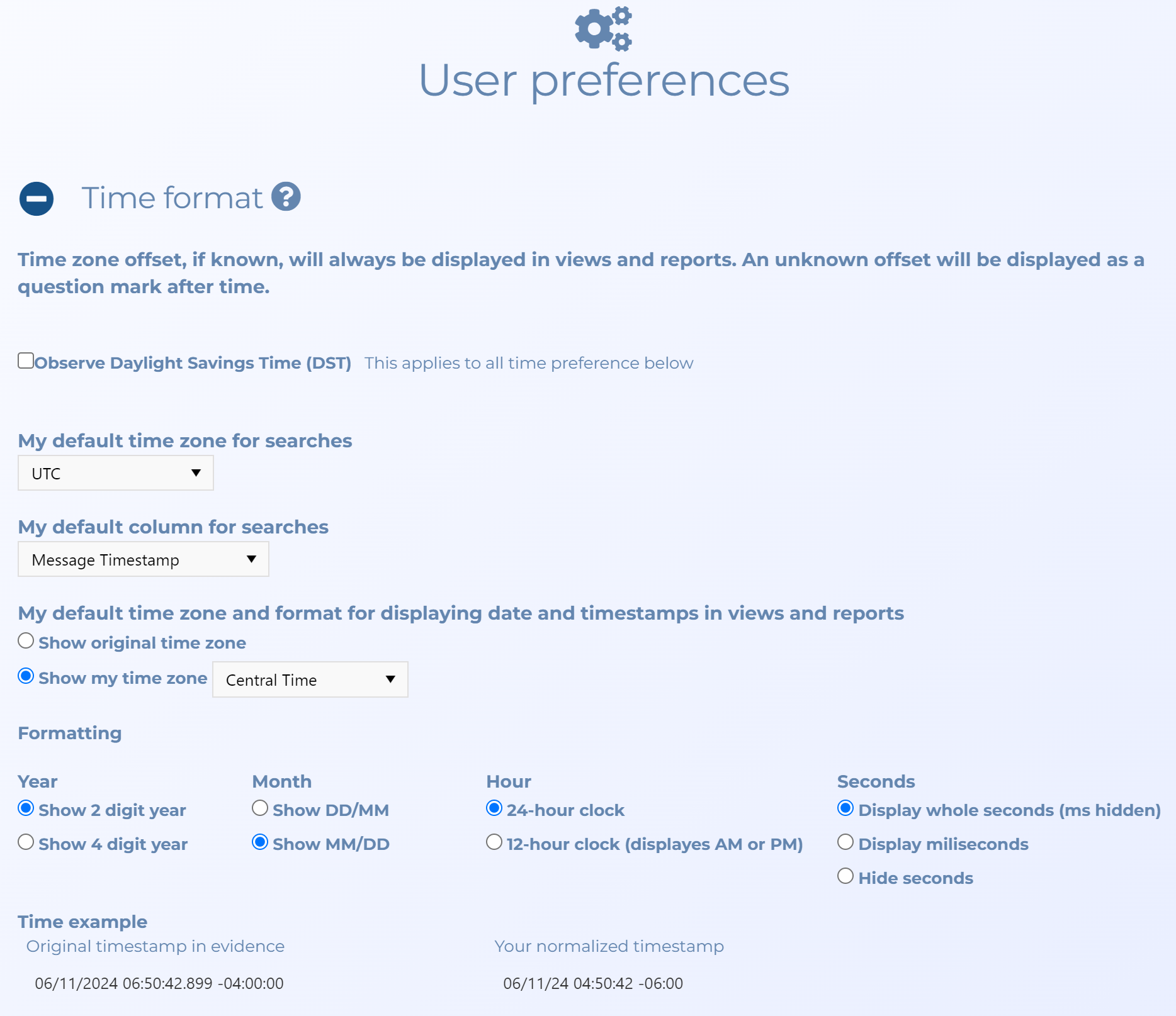 In most instances you will want Observe Daylight Savings Time (DST) selected. You should also verify that you have your preferred settings for My default time zone for searches, My default column for searches and My default time zone and format for displaying date and timestamps in views and reports.