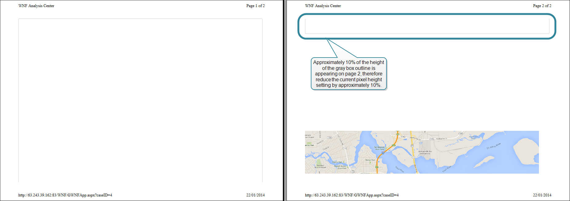 If your print preview displays multiple pages then you must determine what percentage of the map is attempting to display outside of page 1. You can do this by viewing the gray box outline that indicates the area that the map is attempting to display in. For example, in the following graphic there is approximately 10% of the height of the gray box outline appearing on page 2. This indicates that the height setting should by reduced by approximately 10%.