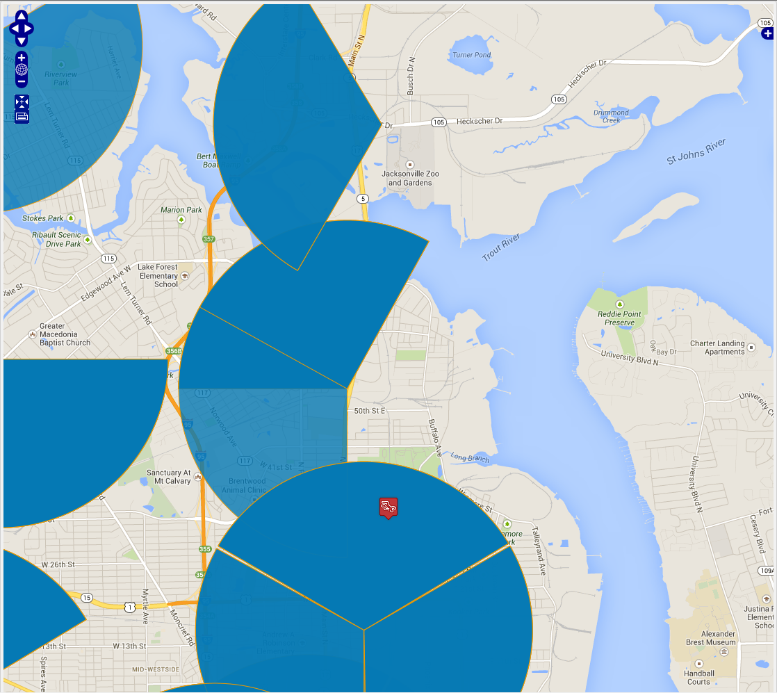 - If required you can adjust this map to display different details. For example, you can zoom in and out of the map, pan across the map, display the target location details, and select and deselect calls from sectors.