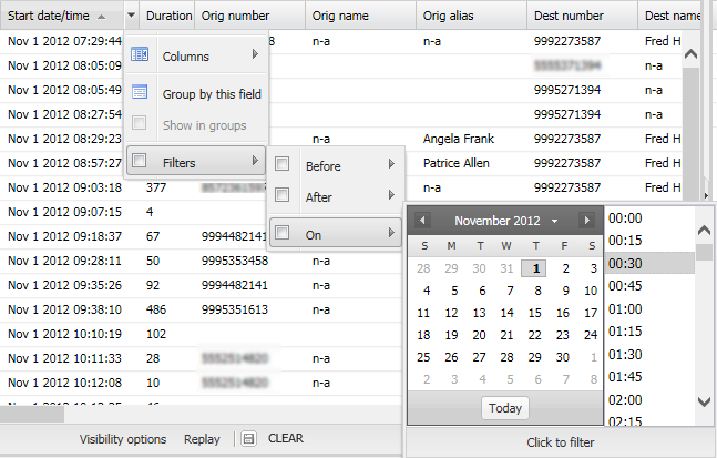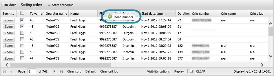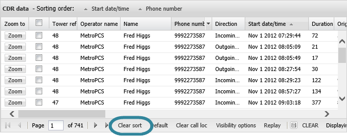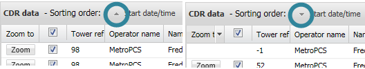 The tab listings can be sorted and grouped in a variety of ways. For example, by default the CDR data tab lists the data in date/time order with the earliest data listed first and the Sector data tab lists the data in usage order with the most frequently used sector listed first. The following procedure explains how to use this feature.