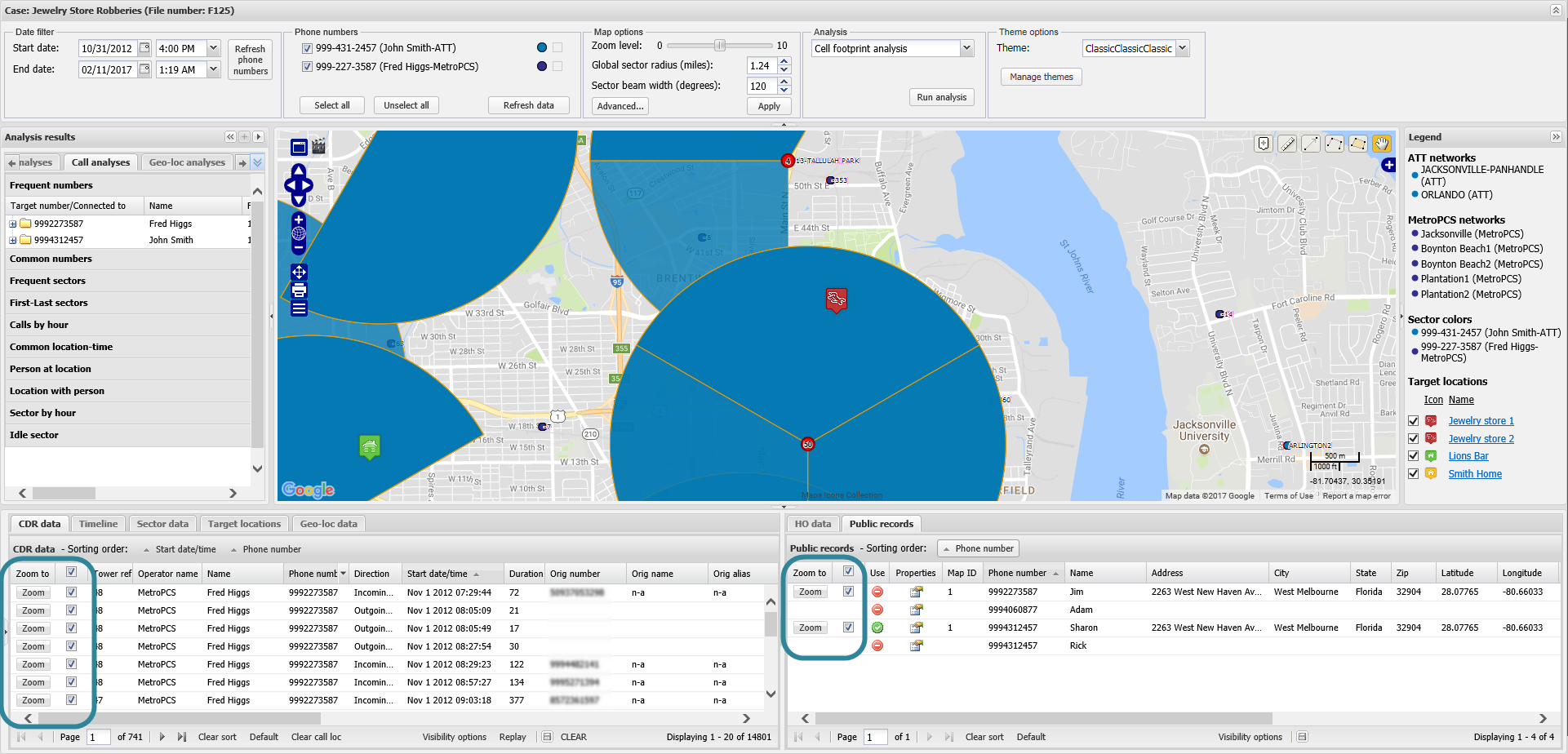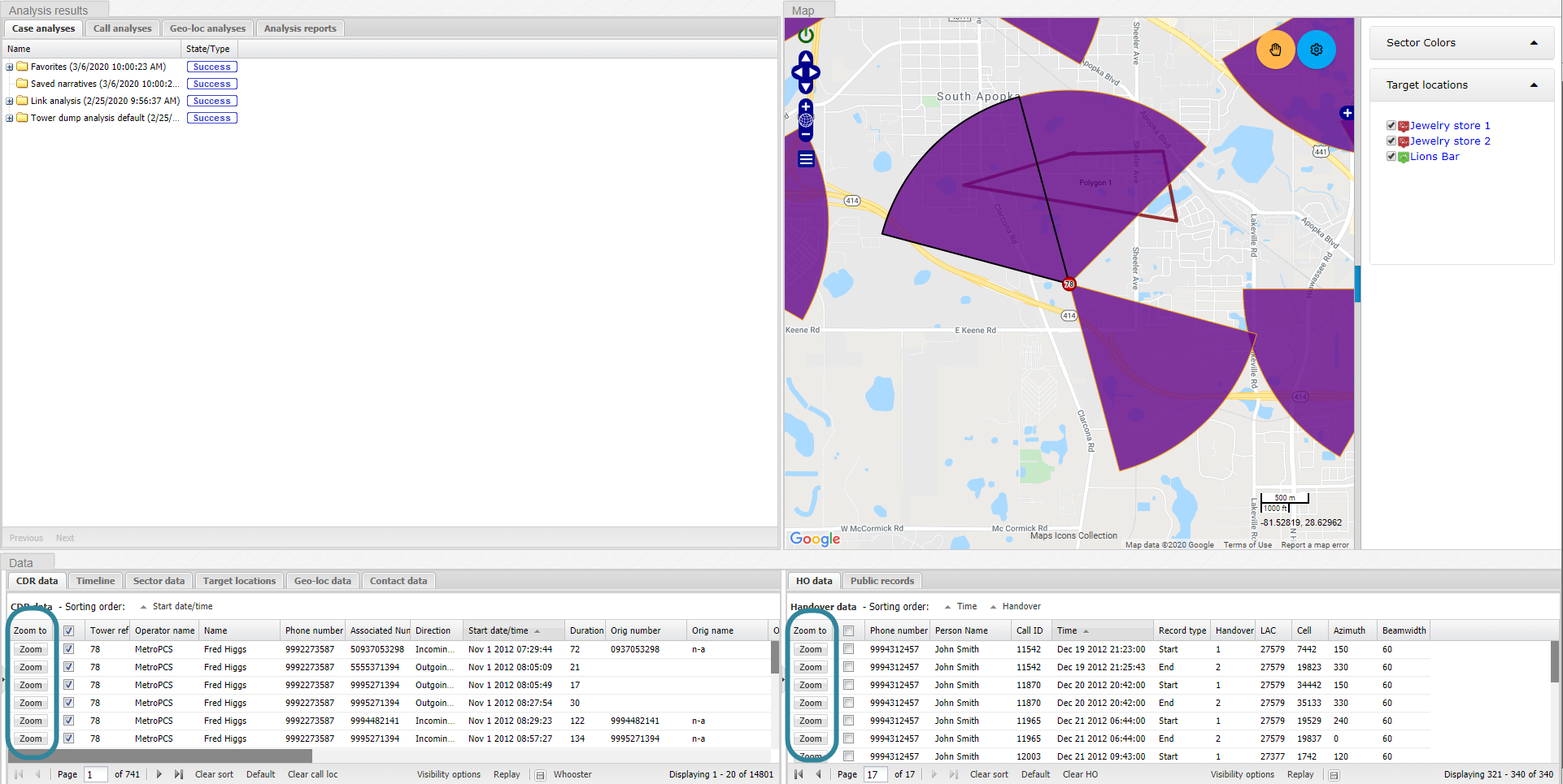 On most of the tabs you can click Zoom to move to center that record on the map. The record is centered on the map using the range currently set in Zoom level.