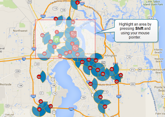 By pressing Shift and dragging the mouse pointer to highlight an area you can zoom to a specific area on the map. When you release the mouse you zoom in to the selected area.