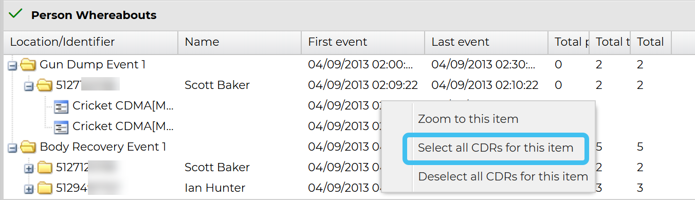 On the Call analyses tab right-click the event with person's device identifier you want to investigate further, then select Select all CDRs for this item.