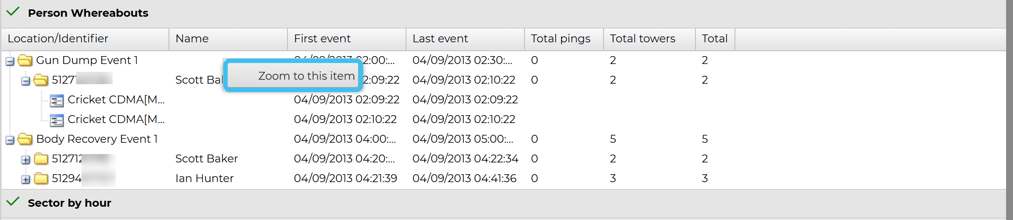 To zoom to the person's location, right-click any event which has a location such as sector, then select Zoom to this item.